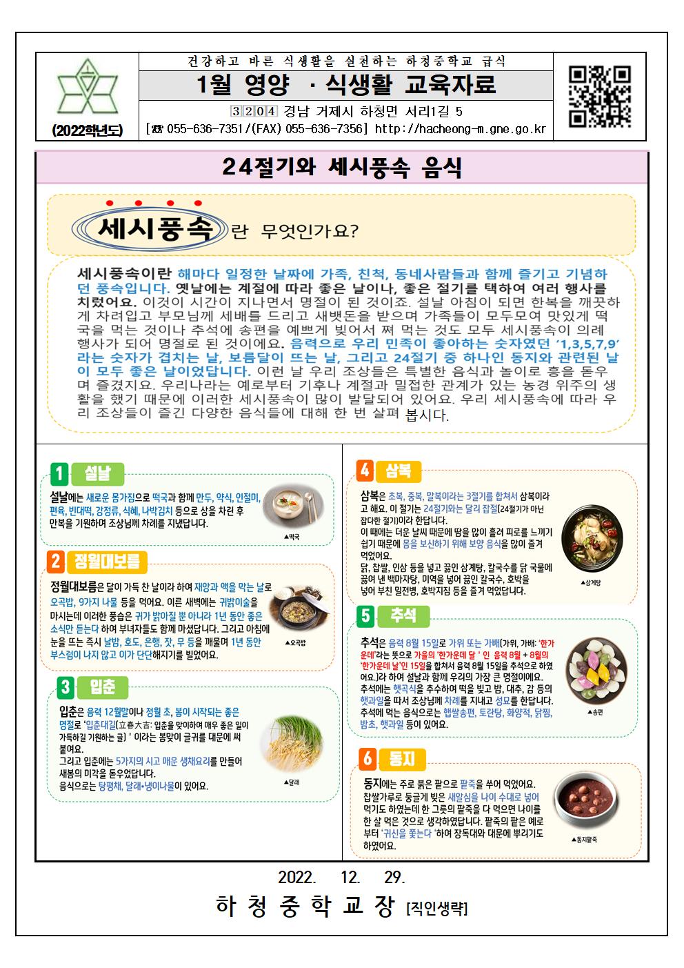 2023. 1월 식단표 및 영양·식생활 교육자료