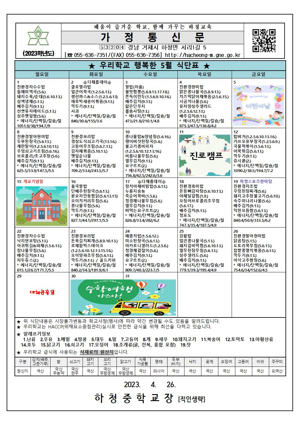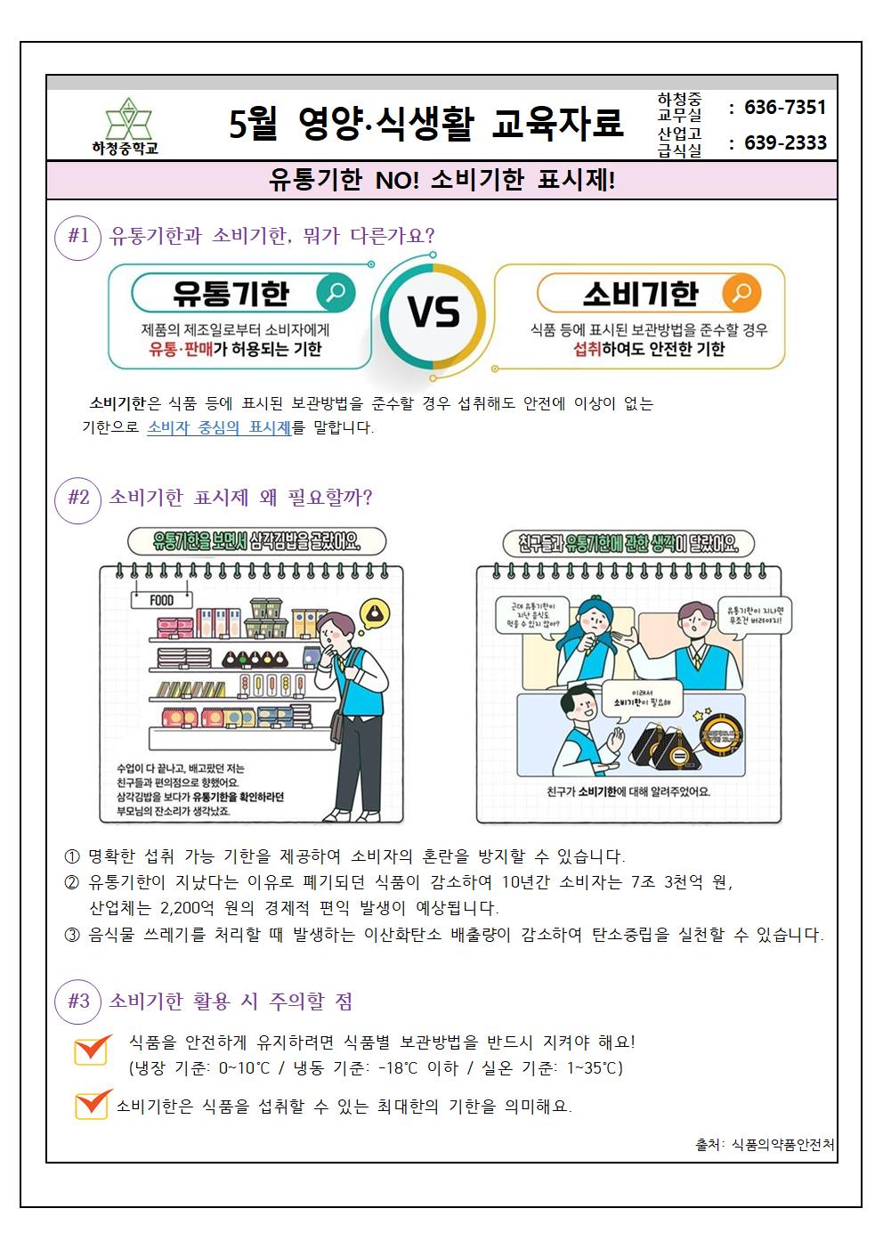 2023. 5월 식단표 및 영양·식생활 교육자료(유통기한NO, 소비기한 표시제!)