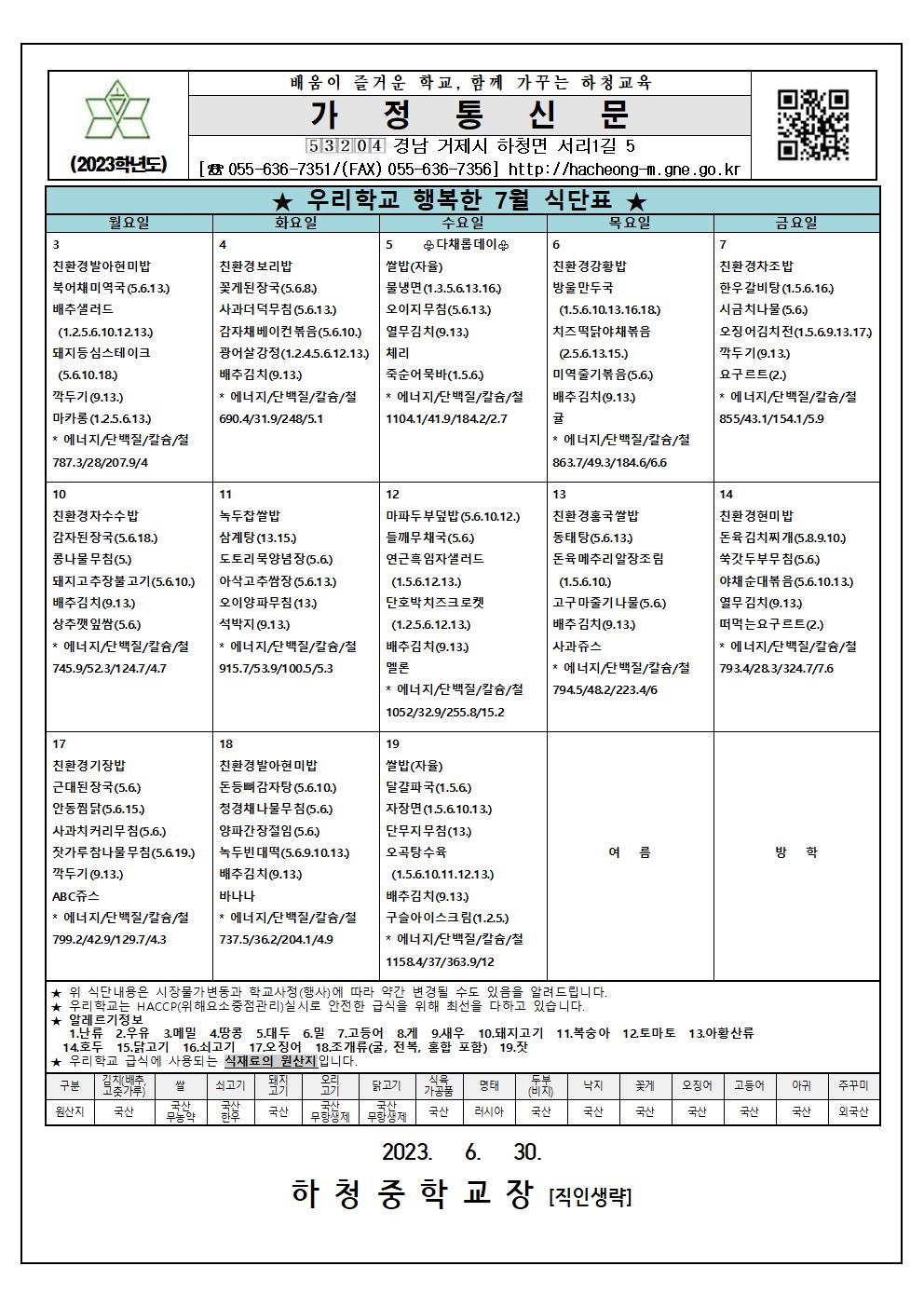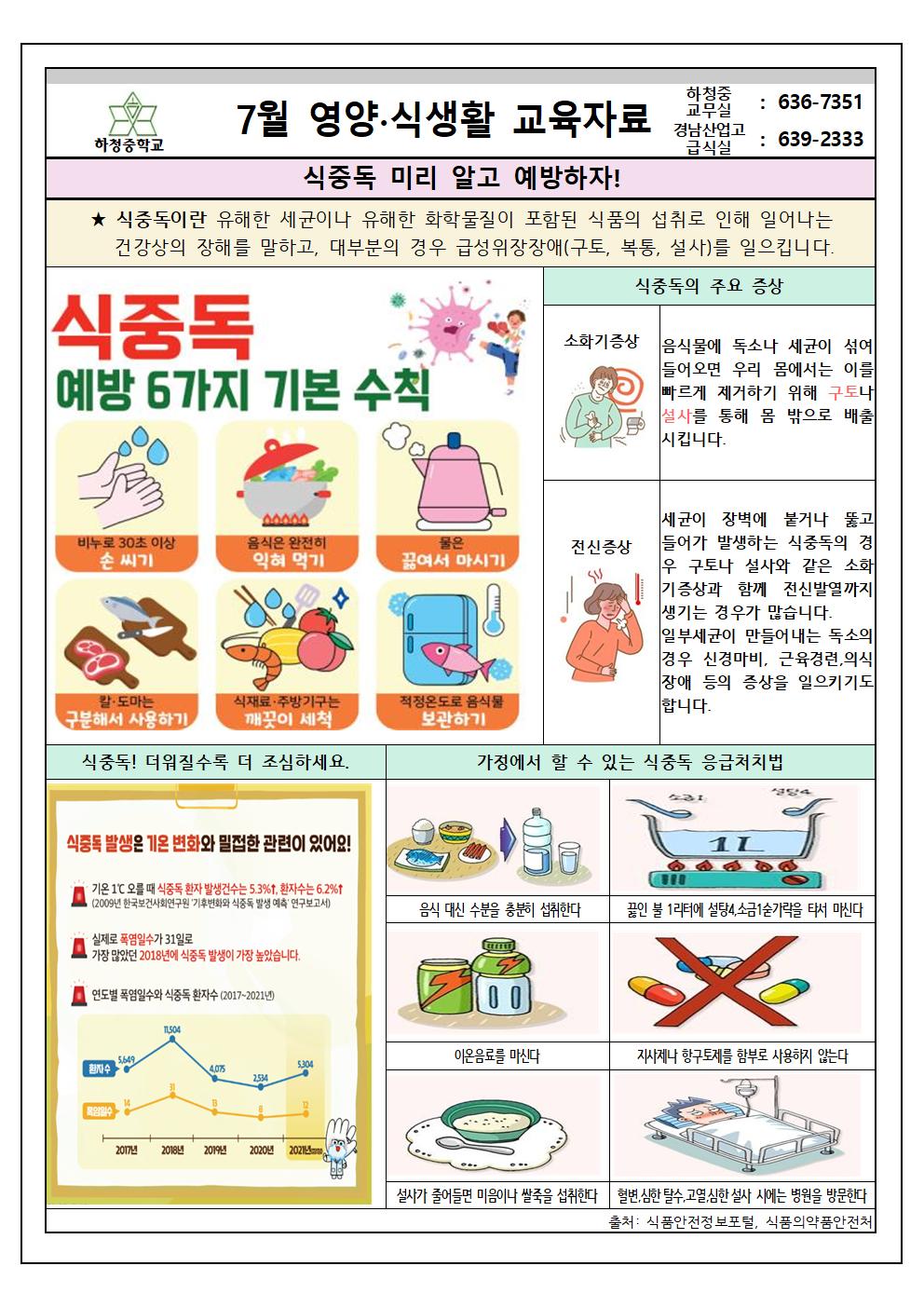 2023년 7월 식단표 및 영양·식생활 교육자료(식중독)